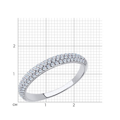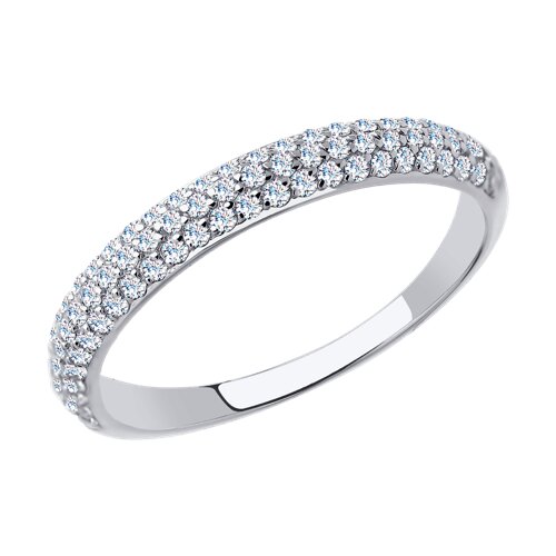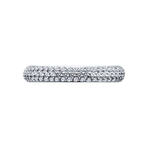 Элегантное кольцо, украшенное тройной дорожкой фианитов, выполнено из белого золота 585 пробы