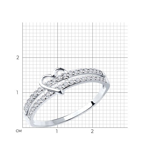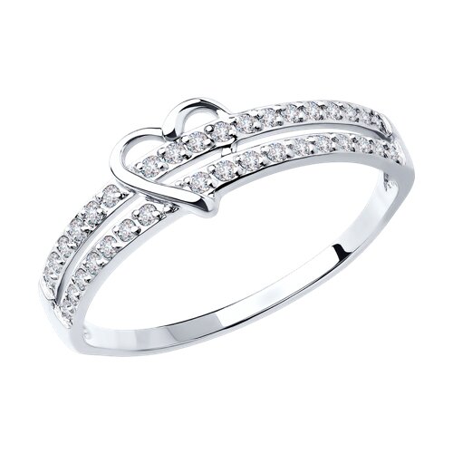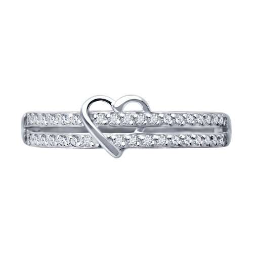 Романтичное кольцо, украшенное сердечком и двойной дорожкой сверкающих фианитов, выполнено из белого золота 585 пробы