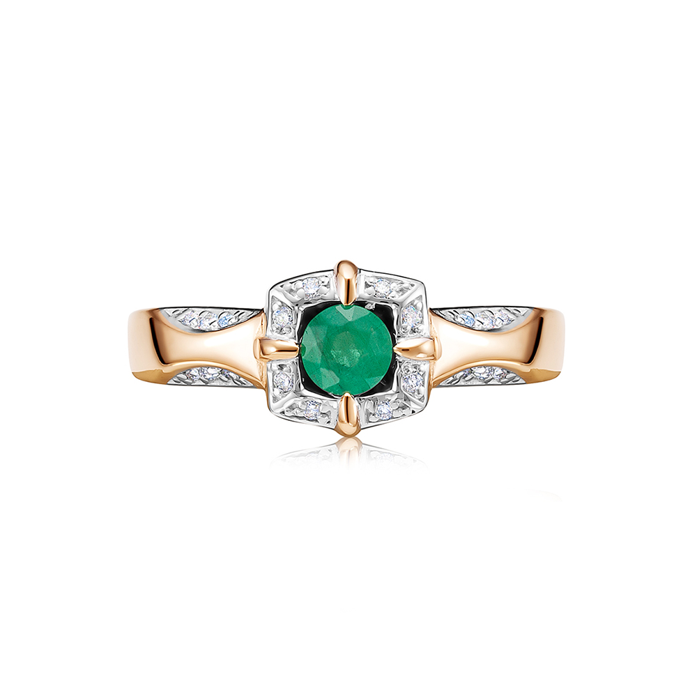 Кольцо с изумрудом, насыщенный цвет которого подчёркивают сияющие бриллианты, выполнено из красного и белого золота 585 пробы