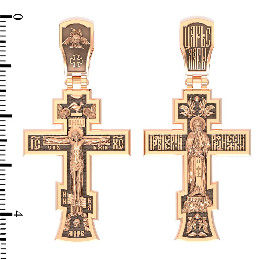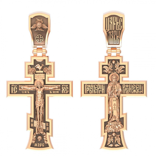Подвеска в виде православного креста выполнена в красном золоте 585 пробы. На лицевой стороне нательного креста изображено Распятие Господа Иисуса Христа.Также Распятие сопровождается надписями, олицетворяющими Христа - это святое имя Христа «IC» (Иисус) «ХС» (Христос). На кулонном кольце написано «Царь Славы».На обороте изображен Преподобный Сергий Радонежский - основатель Троице-Сергиевой Лавры, учитель и наставник многих десятков русских святых. Преподобный стал поистине игуменом и заступником всей Русской Земли, образцом кротости и смирения для монахов и мирян. Преподобному Сергию молятся о помощи в учении, о преодолении страстей, особенно гордыни, о возрастании веры. В комплект поставки входит: