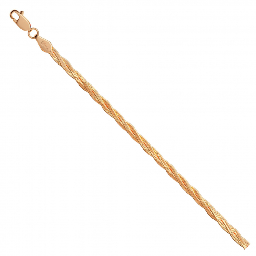 Шикарный браслет из красного золота 585 пробы оснащен плетением «Монтреальская косичка», состоящим из трёх элегантных цепочек, соединённых в единое целое