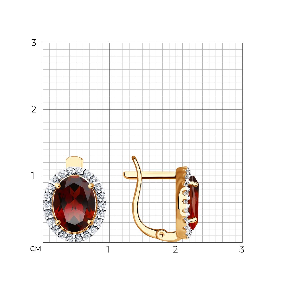 Роскошные элегантные серьги с натуральными гранатами в окружении россыпи сверкающих фианитов, выполнены с сочетанием красного и белого золота 585 пробы