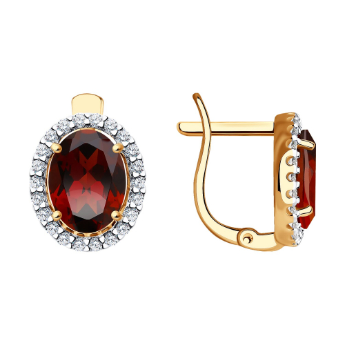 Роскошные элегантные серьги с натуральными гранатами в окружении россыпи сверкающих фианитов, выполнены с сочетанием красного и белого золота 585 пробы. Ювелирная классика - эти серьги отличаются хоть и простым, но изысканным и красивым дизайном. Тип замка - английский, самый надежный и удобный. Изделие представлено брендом "SOKOLOV". Средняя характеристика камней: 2 Гранат, 44 Фианит. В комплект поставки входит: