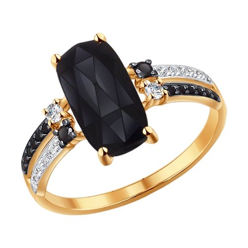 Контрастное кольцо выполнено в ярком сочетании красного и белого золота 585 пробы. В центре кольца мерцает крупный черный агат прямоугольной формы. Графичный рисунок кольца поддерживают линии черных и бесцветных фианитов.