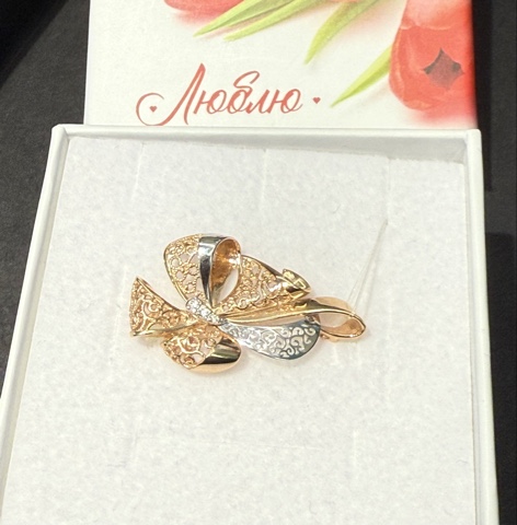 Ажурная брошь «Бант» из красного и белого золота 585 пробы с эффектом скани и фианитами