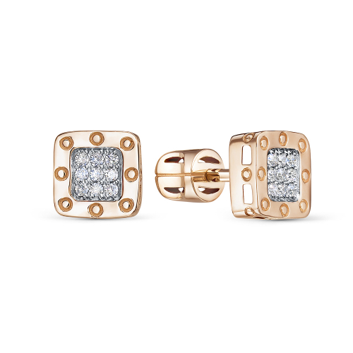 Стильные серьги - пусеты в геометрическом стиле, инкрустировны сияющими фианитами, выполнены в сочетании красного и белого золота 585 пробы