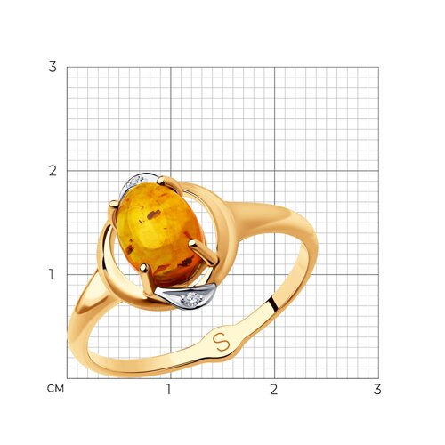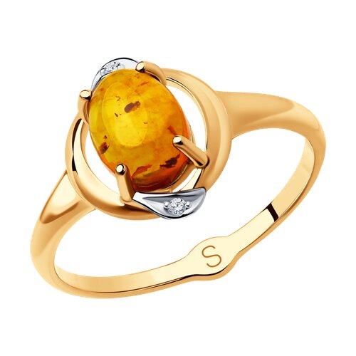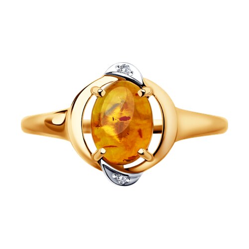 Кольцо с натуральным янтарём, красоту которого подчёркивают искры фианитов, выполнено с сочетанием красного и белого золота 585 пробы