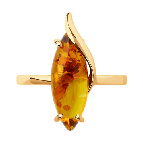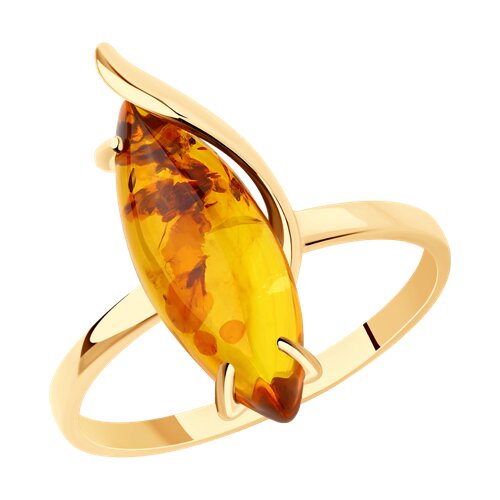 Кольцо с натуральным янтарём выполнено из красного золота 585 пробы. Надежные крапановые закрепки пропускают свет со всех сторон, тем самым полностью раскрывая необычную красоту камня. Изделие представлено брендом SOKOLOV. Вставки: 1 × Янтарь пресс.недраг Коричневый Маркиз 16.00*6.00 ~0,997 кар. В комплект поставки входит: