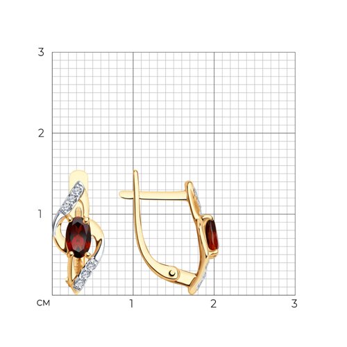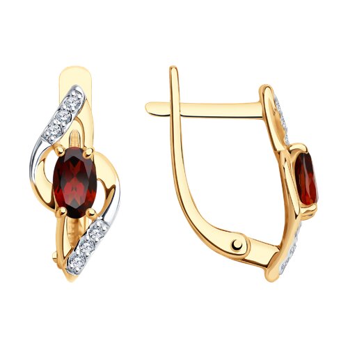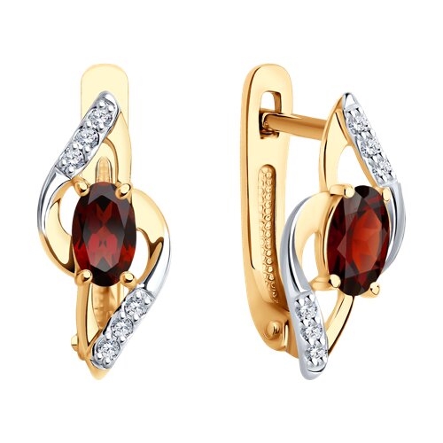 Изящные серьги с гранатами, красоту которых подчёркивают дорожки фианитов, выполнены из красного и белого золота 585 пробы. Сочетание белого и красного золота придаёт украшению дополнительный шарм и элегантность, а блеск камней просто приковывает взгляд. Тип замка - английский, самый надежный и удобный. Изделие представлено брендом SOKOLOV. Вставки: 12 × Фианит недраг Бесцветный Круг 1.00 ~0,102 кар, 2 × Гранат Овал 5.00*3.00 ~0,579 кар. В комплект поставки входит: