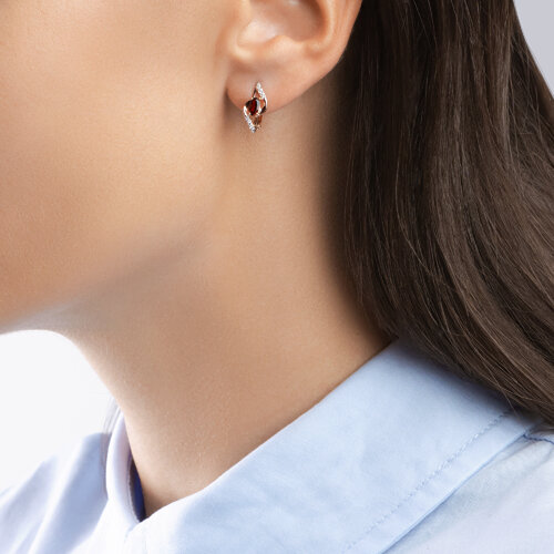 Изящные серьги с гранатами, красоту которых подчёркивают дорожки фианитов, выполнены из красного и белого золота 585 пробы
