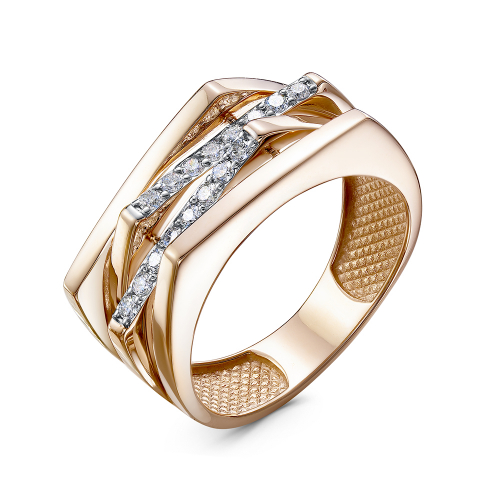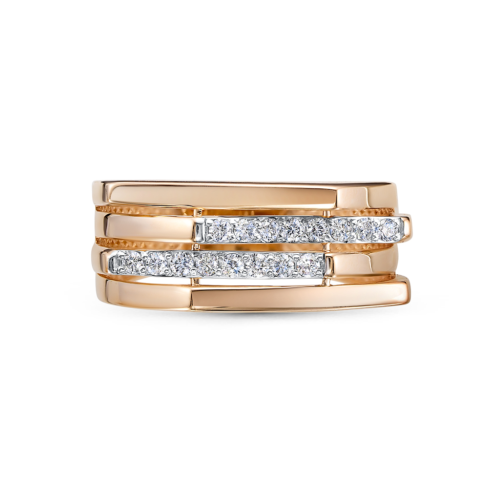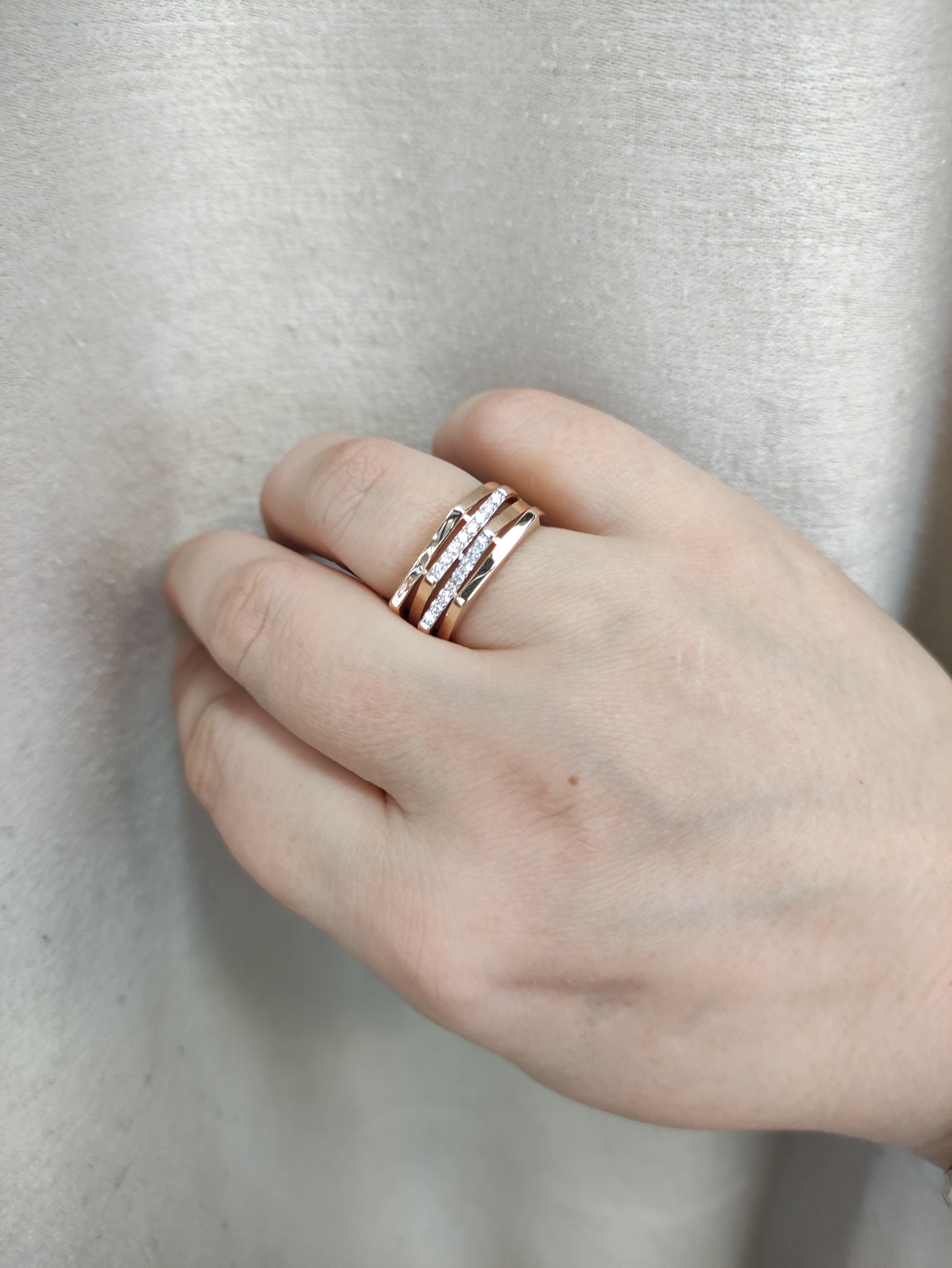 Стильное объемное кольцо, украшенное дорожками сияющих бриллиантов, выполнено в сочетании красного и белого золота 585 пробы