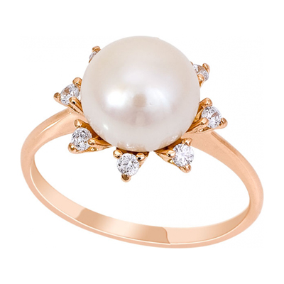 Кольцо с жемчугом, нежное сияние которого подчёркивают сверкающие фианиты, выполнено из красного золота 585 пробы