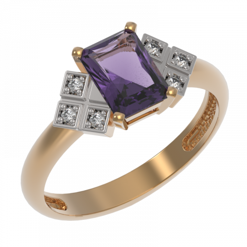 Кольцо с сверкающим аметистом, красоту которого подчёркивают искры фианитов, выполнено из красного и белого золота 585 пробы