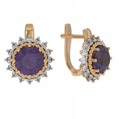 Серьги с яркими аметистами, в окружении сверкающих фианитов, выполнены из красного и белого золота 585 пробы