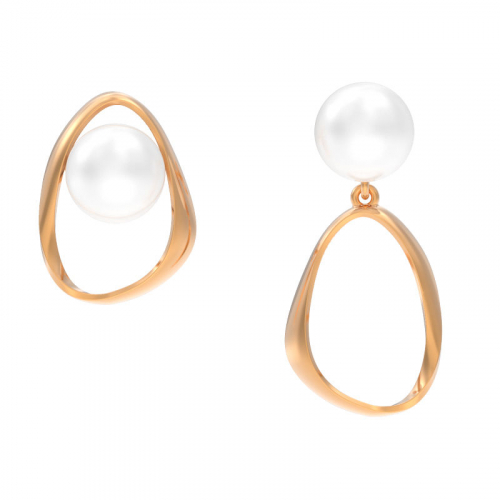Стильные ассиметричные серьги-пусеты с жемчугом выполнены из красного золота 585 пробы