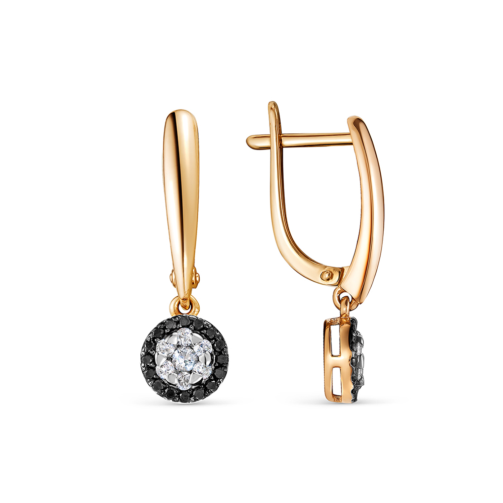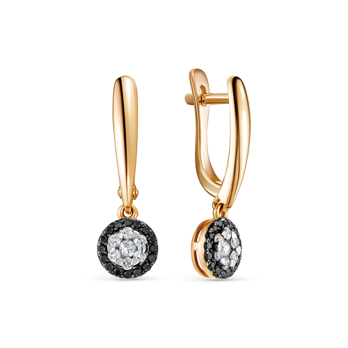 Роскошные серьги с сверкающими чёрными и бесцветными бриллиантами выполнены из красного золота 585 пробы