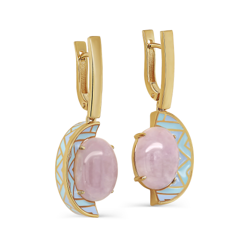 Шикарные удлиненные серьги с редким камнем Кунцит, дополненные эмалью и золочением, выполнены из серебра 925 пробы