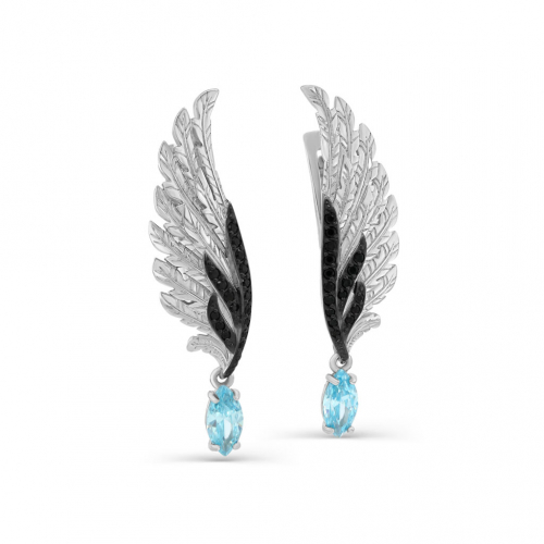 Удлинённые серьги из коллекции "Обретая крылья" от бренда KABAROVSKY с чёрными и голубыми фианитами, выполнены из серебра 925 пробы