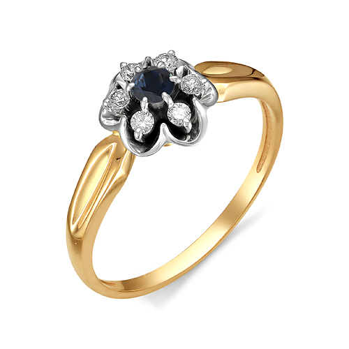 Кольцо "малинка", выполненное в классическом стиле, с оригинальной верхушкой в виде цветка, украшенной натуральными сапфиром и бриллиантами