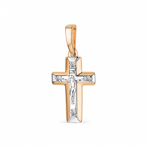 Подвеска в форме крестика выполнена в сочетании красного и белого золота 585 пробы и украшена сверкающими бриллиантами