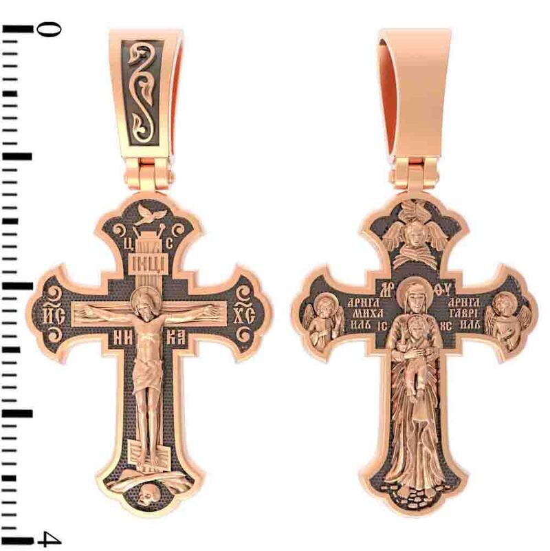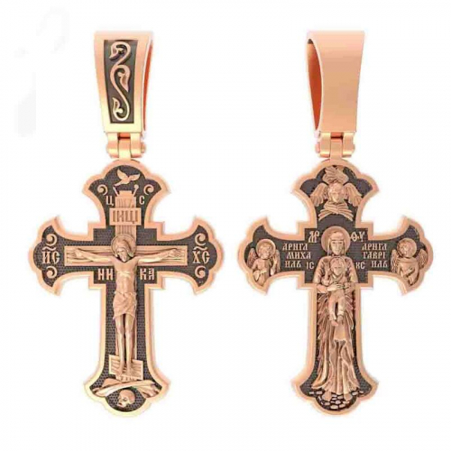 Подвеска - православнй крест, выполнена из красноо золота 585 пробы. Крест соответствует всем канонам православной церкви. На лицевой стороне нательного креста изображено Распятие Иисуса Христа. На обратной стороне креста в полный рост изображена Валаамская икона Божией Матери, над которой раскрыл свои крылья серафим. Такие кресты широко употреблялись в Византии, а позднее и на Руси. В комплект поставки входит: