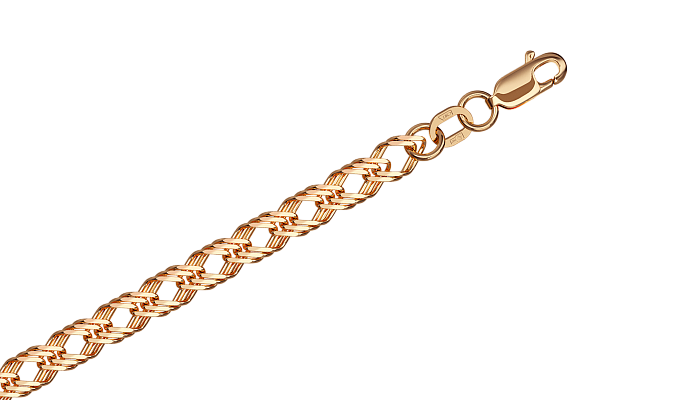 Облегчённая цепь из красного золота 585 пробы с оригинальным плетением «Тройной ромб» и великолепной отделкой алмазной гранью. Изящные ромбообразные звенья, расположенные слоями, образуют сложную и вместе с тем гармоничную фигуру, создавая ощущение многослойности и игры света. Такой рисунок придает изделию роскошный и благородный вид, а специальная обработка алмазной гранью обеспечивает особый блеск и привлекательность. Пользуется огромной популярностью среди покупателей благодаря оптимальному балансу между эстетикой и прочностью. Эта цепочка надолго сохранит свой праздничный блеск и станет замечательным украшением как сама по себе, так и в сочетании с подвеской. Смотрится стильно на мужчинах, и на женщинах. Диаметр проволки 0,50 мм. Представлено брендом КРАСЦВЕТМЕТ.