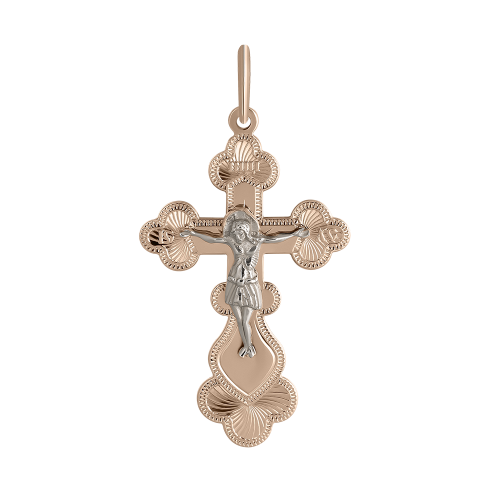 Подвеска в виде православного креста выполнена с сочетанием красного и белого золота 585 пробы, в нем исполнены все каноны православной церкви, на внешней стороне креста распятие, на обороте надпись "спаси и сохрани"