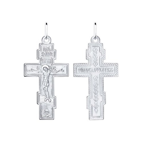 Подвеска в виде нательного креста прямой формы выполнена из серебра 925 пробы. Крест соответствует всем канонам Православной церкви, на внешней стороне - распятие, на обороте надпись "Спаси и сохрани". Украшение покрыто металлом платиновой группы - родием, он защищает серебро от потемнения и придает искрящийся яркий блеск. Изделие представлено брендом "SOKOLOV". В комплект поставки входит: