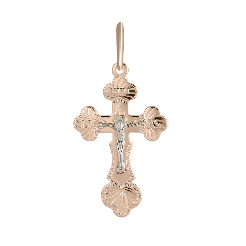 Подвеска в виде православного креста выполнена с сочетанием красного и белого золота 585 пробы, в нем исполнены все каноны православной церкви, на внешней стороне креста распятие, на обороте надпись "спаси и сохрани". Крест украшен практичной и долговечной обработкой - алмазной гравировкой. Изделие представлено брендом МАГНАТ. В комплект поставки входит: