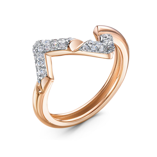 Геометричное кольцо, украшенное сверкающими фианитами, выполнено с сочетанием красного и белого золота 585 пробы