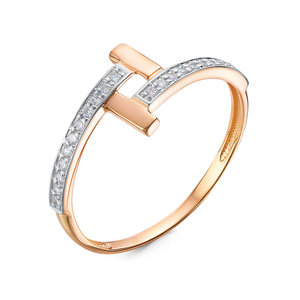 Кольцо с оригинальным дизайном в виде буквы Т, выполнено с сочетанием красного и белого золота 585 пробы, украшено дорожками фианитов