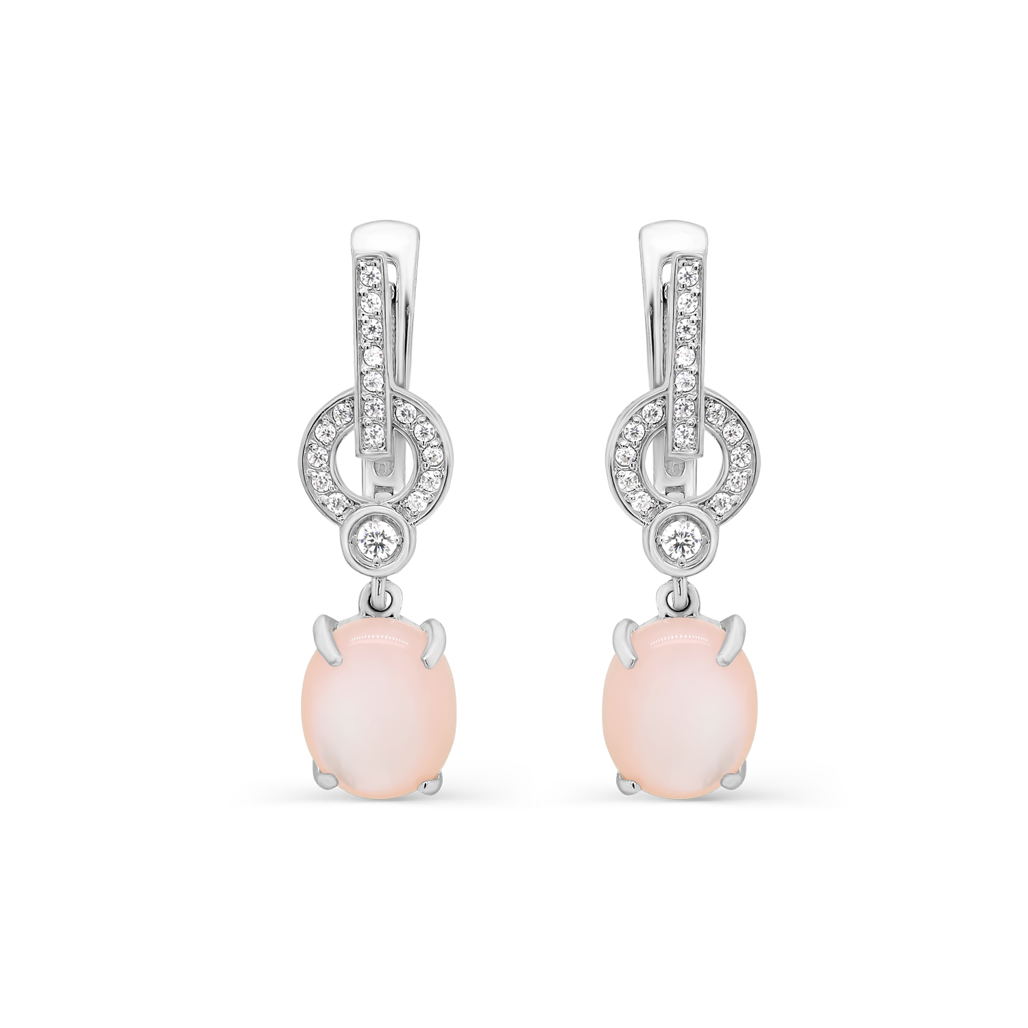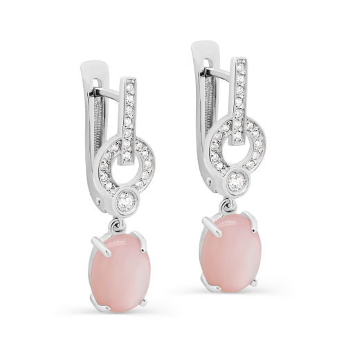 Удлиненные серьги классической формы выполнены из серебра 925 пробы с розовым перламутром и сияющими фианитами