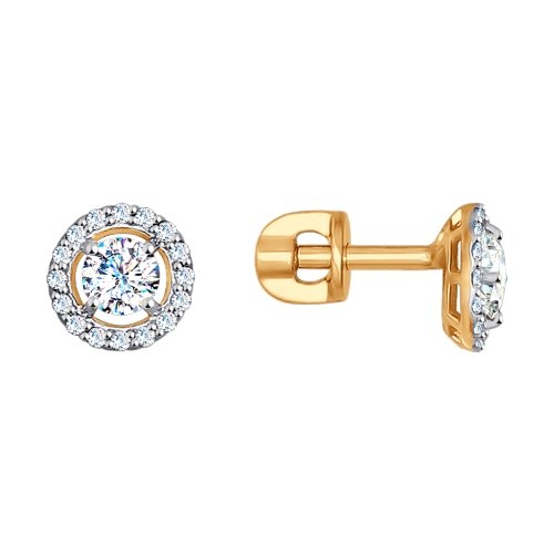 Серьги-пуссеты выполнены в сочетании красного и белого золота 585 пробы. Каждая серьга украшена сверкающим фианитом, который окружен хороводом из миниатюрных фианитов на фоне белого золота, что делает серьги нарядными.