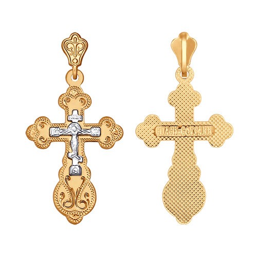 Подвеска в виде декоративного крестика исполнена из комбинированного золота 585 пробы и дополнена гравировкой. В комплект поставки входит: