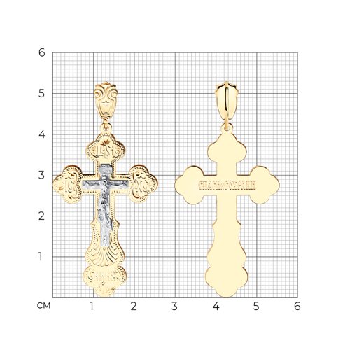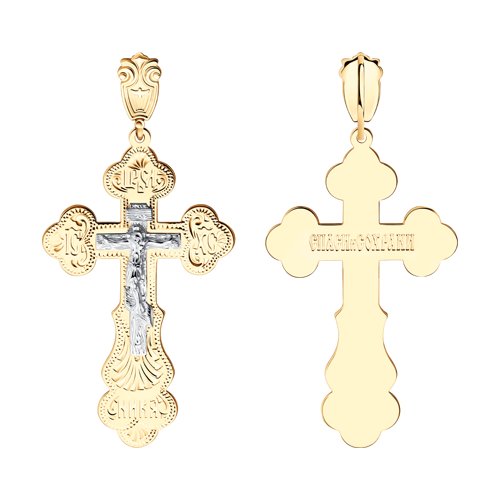 Православный крест с гравировкой, в котором исполнены все каноны Православной Церкви, выполнен из красного и белого золота 585 пробы.На оборотной стороне надпись "Спаси и сохрани". Изделие представлено брендом SOKOLOV. В комплект поставки входит: