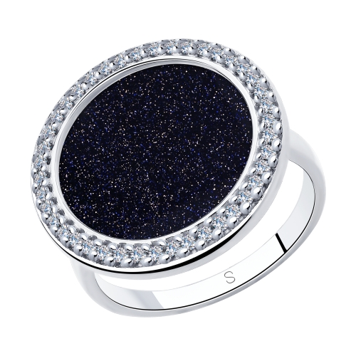 Объемное кольцо выполнено в серебре 925 пробы. Сердце кольца украшено синим авантюриновым стеклом, окруженным линией фианитов, которые добавляют сияния темному, как ночное небо, стеклу.