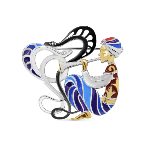 Брошь из коллекции "ВОСТОЧНЫЕ СКАЗКИ", выполнена из родированного и позолоченного серебра 925 пробы, украшена фианитами и цветной ювелирной эмалью. Изделие покрыто родием, драгоценным металлом платиновой группы, который делает серебро устойчивым к повреждениям и сохраняет искрящийся блеск. Украшение представлено брендом KABAROVSKY. Вставки: 2 Фианит Кр 1,00; 1 Фианит Кр 2,00; В комплект поставки входит: