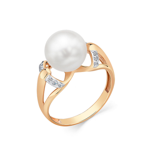 Кольцо выполнено в сочетании красного и белого золота 585 пробы с жемчугом и искрящимися фианитами