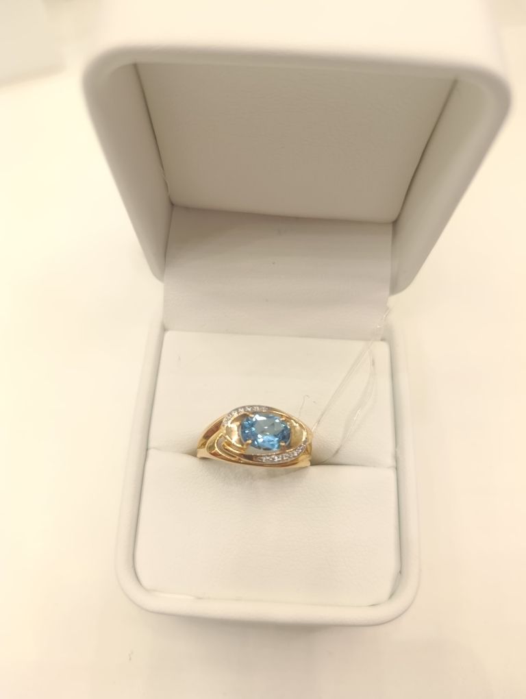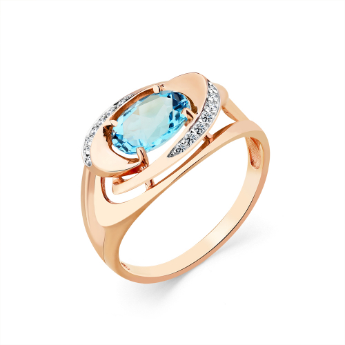 Элегантное кольцо с нежно-голубым топазом swiss, красоту которого подчёркивает сверкающая дорожка фианитов, выполнено в сочетании красного и белого золота 585 пробы