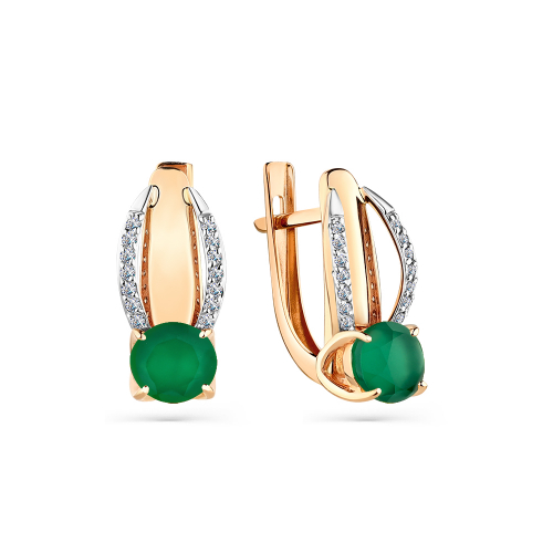 Яркие стильные серьги выполнены из красного золота 585 пробы, украшены великолепными агатами зелёного цвета и сверкающими фианитами