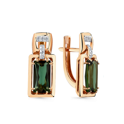 Яркие и привлекательные серьги, украшенные турмалином и россыпью фианитов, выполнены из красного золота 585 пробы