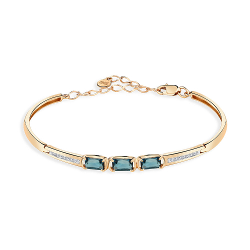 Элегантный женский жесткий браслет из красного золота 585 пробы, украшенный тёмно-синим топазом Лондона и сверкающими фианитами, — это украшение, которое подарит своему владельцу ощущение роскоши и элегантности