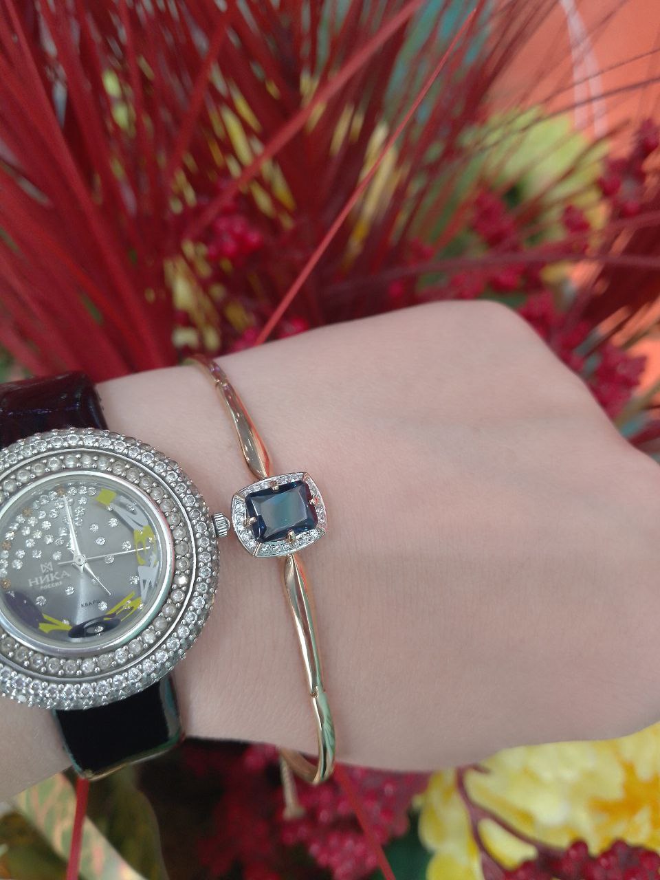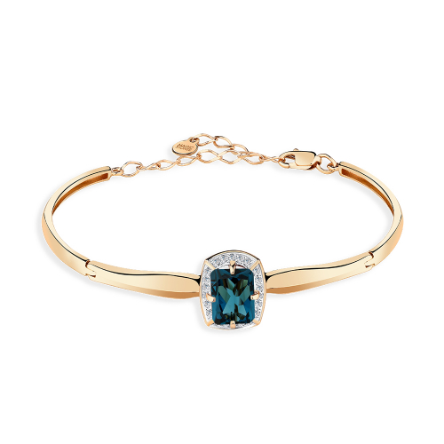 Элегантный жесткий браслет из красного и белого золота 585 пробы, украшенный темно-синим топазом Лондон и сверкающими фианитами, — это произведение ювелирного искусства, которое подчеркнет ваш изысканный вкус и чувство стиля