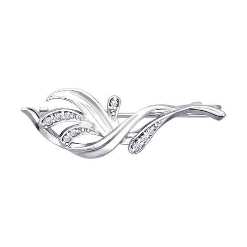 Нежная и романтичная брошь, напоминающая легкое перышко, выполнена в серебре 925 пробы и инкрустирована сверкающими фианитами