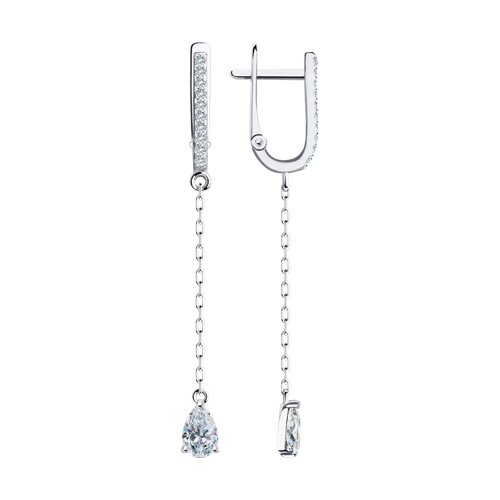 Стильные серьги с подвесками, украшенными сверкающими фианитами, выполнены из белого золота 585 пробы. Белое золото особым образом подчёркивает красоту и блеск камней, усиливая их сияние. С таким украшением вы не останетесь незамеченной. Тип замка - английский, самый надежный и удобный. Изделие представлено брендом SOKOLOV. Вставки: 20 × Фианит недраг Бесцветный Круг 1.00 ~0,170 кар, 2 × Фианит недраг Бесцветный Груша 6.00*4.00 ~1,233 кар В комплект поставки входит: