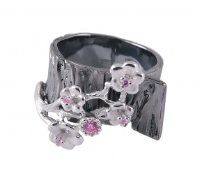 Нежное кольцо, в виде цветущей ветки сакуры на коре дерева, выполнено из серебра 925 пробы, украшено сверкающими фианитами Сваровски нежного розового цвета.