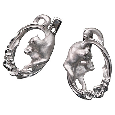 Оригинальные овальные серьги "Кокетка" из серебра 925 пробы украшены парами изящных кошечек.