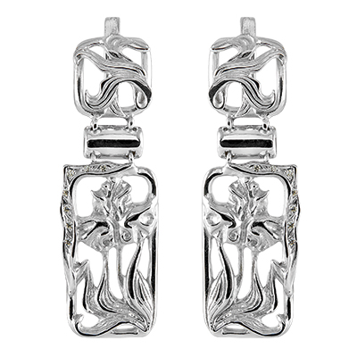 Ажурные удлинённые серьги, с изображением цветка ириса, выполнены из серебра 925 пробы и украшены сверкающими фианитами Сваровски