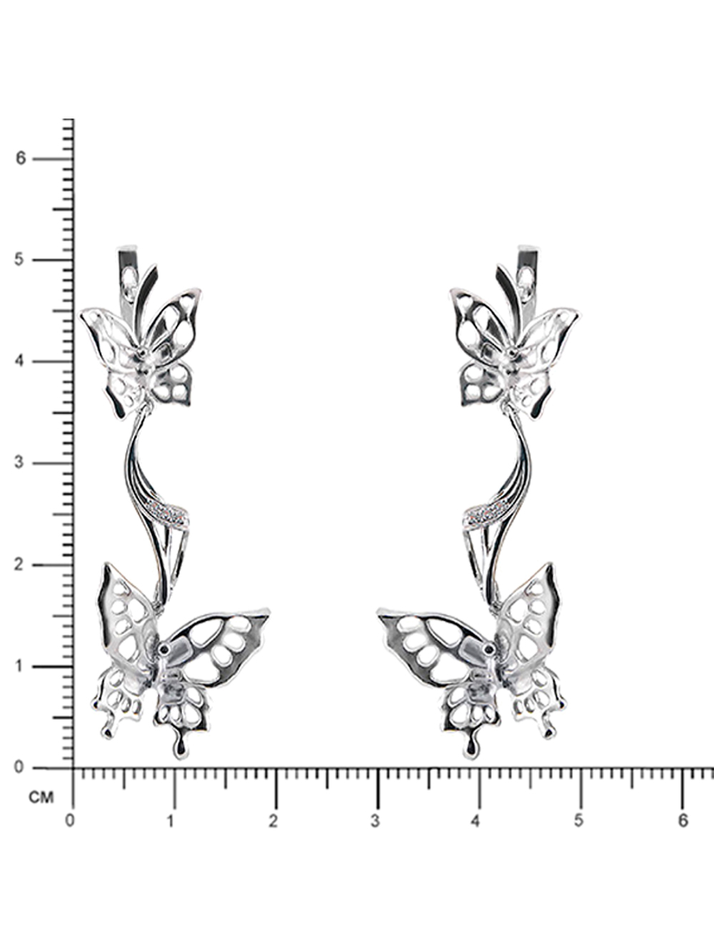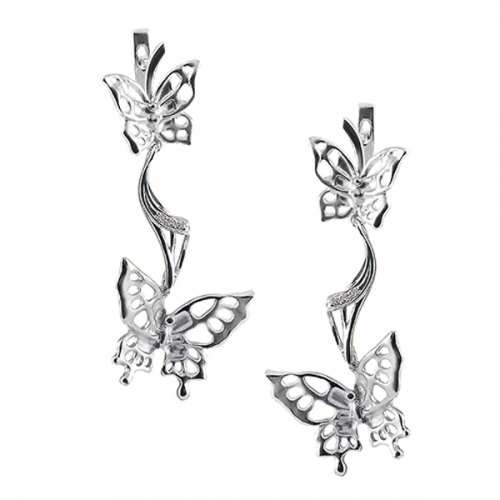 Объемные удлиненные серьги в анималистическом стиле в виде "бабочек" выполнены из серебра 925 пробы, украшенные деликатным блеском сияющих фианитов