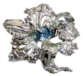 Нежная подвеска, в виде открытой орхидеи, выполнена из серебра 925 пробы, украшена топазом нежно-голубого цвета и сверкающими фианитами Сваровски.